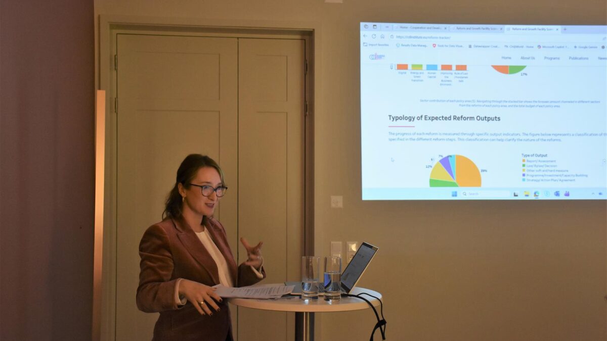 CDI’s Executive Director, Ms. Krisela Hackaj, presented the Reform Tracker’s key features and analytical insights. She noted that although the RGF is designed as a performance-based instrument, it currently places greater emphasis on output indicators than on impact. She argued for moving beyond the rigid “all-or-nothing” approach to a more nuanced application of the RGF regulation, including mechanisms for partial fulfilment assessments for complex cross-sectorial reforms. She framed this shift as essential to transform the RGF from a mere disbursement exercise into an instrument that builds lasting administrative capacity and delivers real impact for citizens.